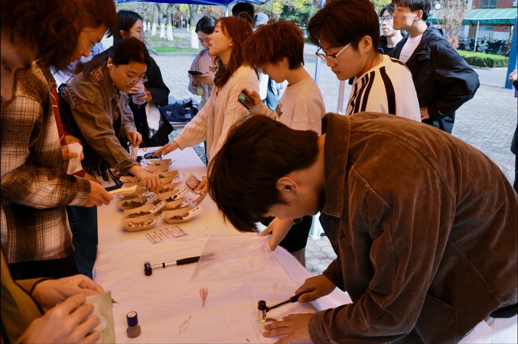 活动精心设置的四大特色体验项目,让传统民俗与春日雅趣相融。漆扇区中,同学们以扇面为纸、漆墨作画,勾勒花鸟、题写诗词,于方寸间致敬千年匠心;投壶区里,众人凝神屏息、瞄准投掷,在一招一式中切磋技艺,喝彩声此起彼伏,犹见古时“君子之争”的从容风仪;拓染区以校园花草为材,将花瓣叶片精心排布于织物之上,以小锤轻敲固色,将转瞬春景定格,正应了“草木有本心”的自然之趣;香囊区内艾草清香萦绕,同学们自主搭配香材、细心缝制装饰,将驱虫避秽、祈福纳吉的美好祝愿装入小小的香囊之中。